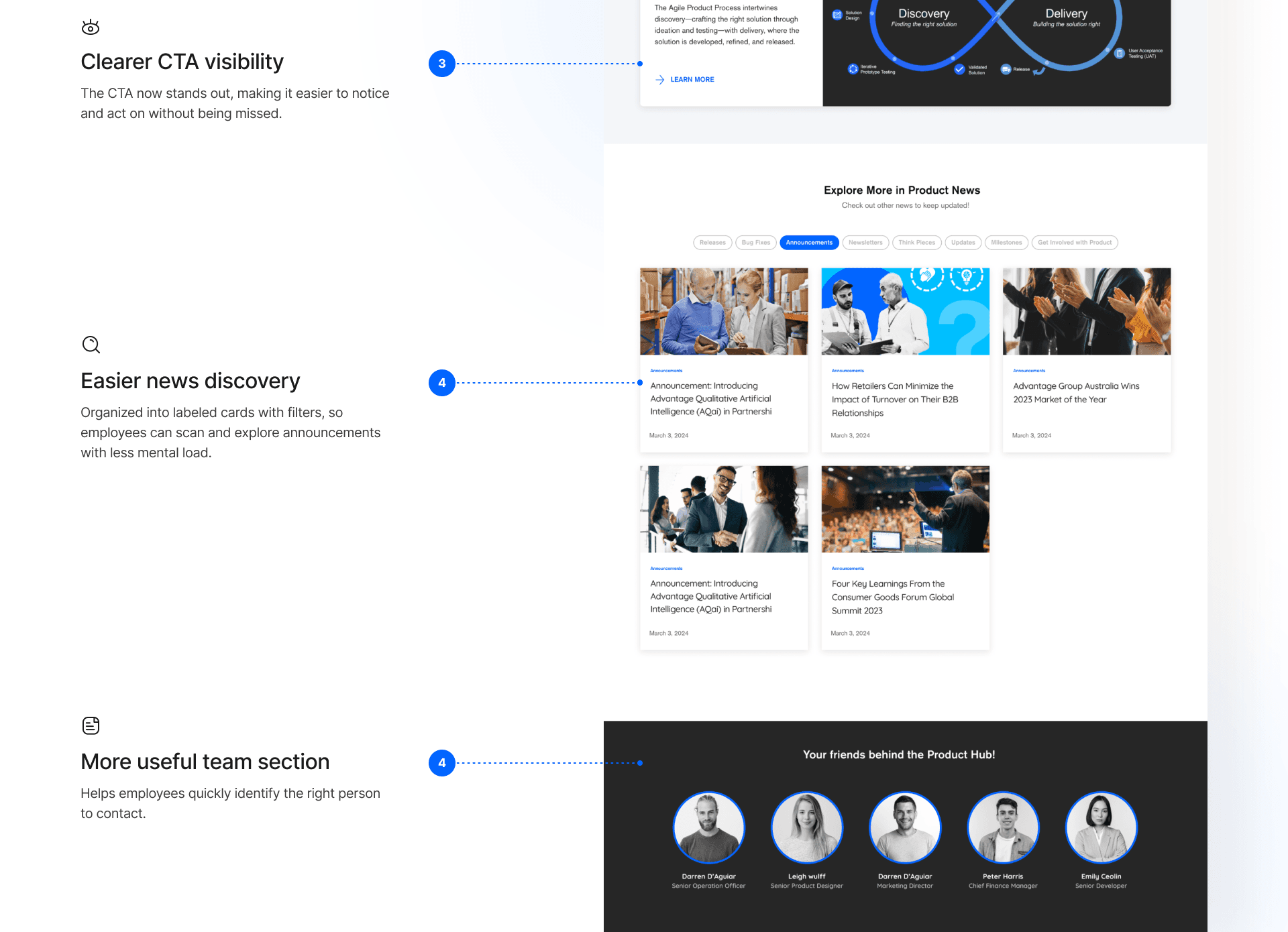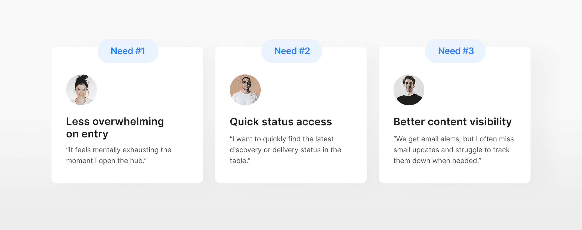 I got to walk through the hub with the Product team and see how they actually used it. It helped me understand what content mattered most and where things felt confusing. From there, we aligned on three key focus areas to guide the redesign.