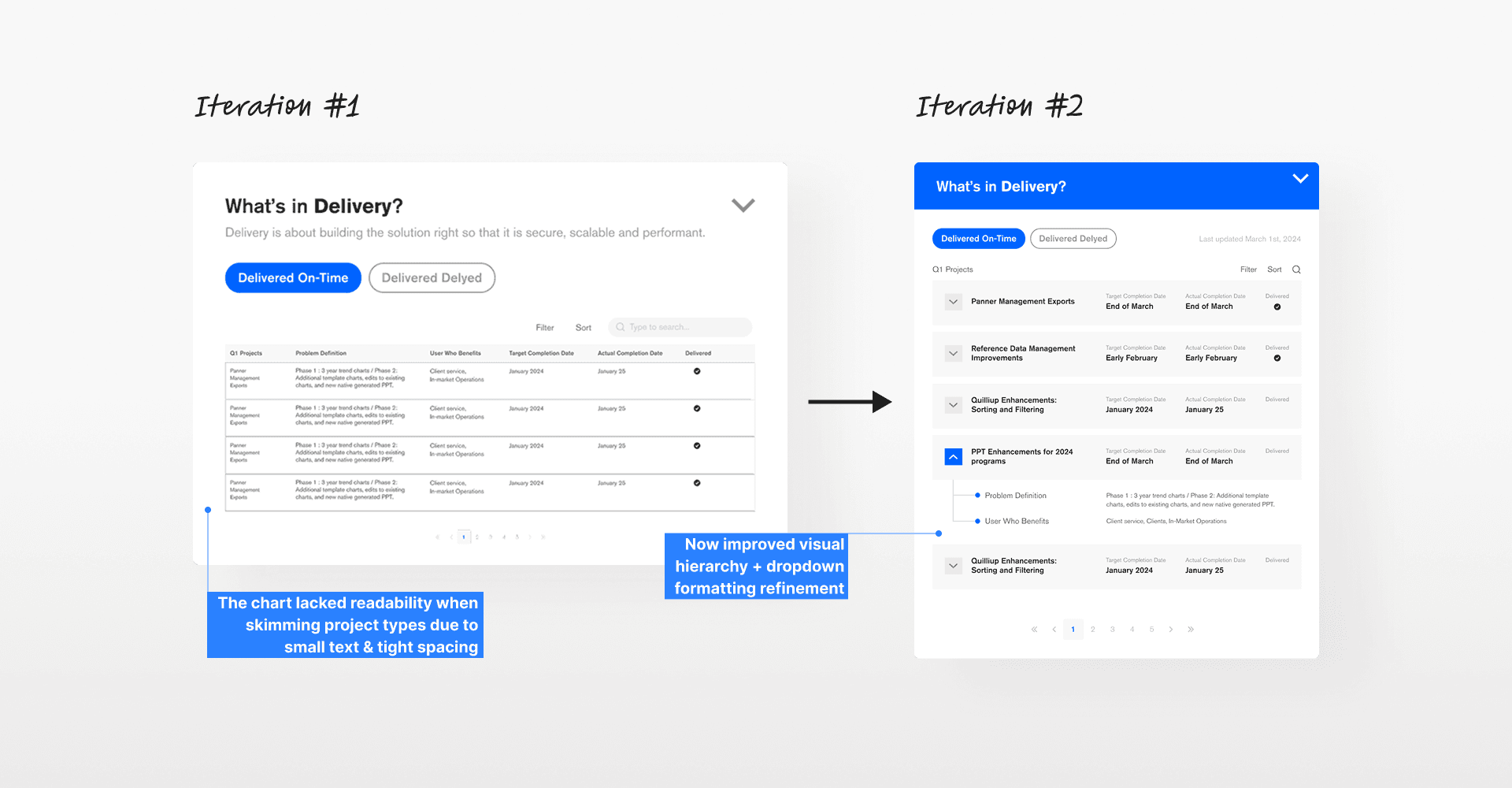 The font felt too small especially for longer descriptions. The tight spacing and packed rows also made it hard to scan quickly. So I went back and made the text bigger, added breathing room, and adjusted the layout so the important details are easier to spot.