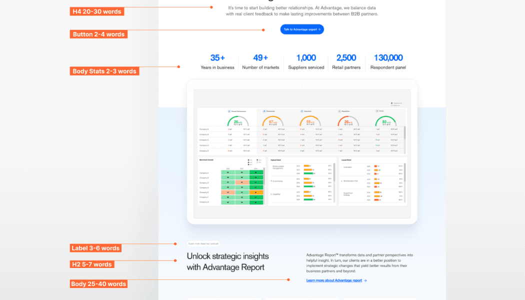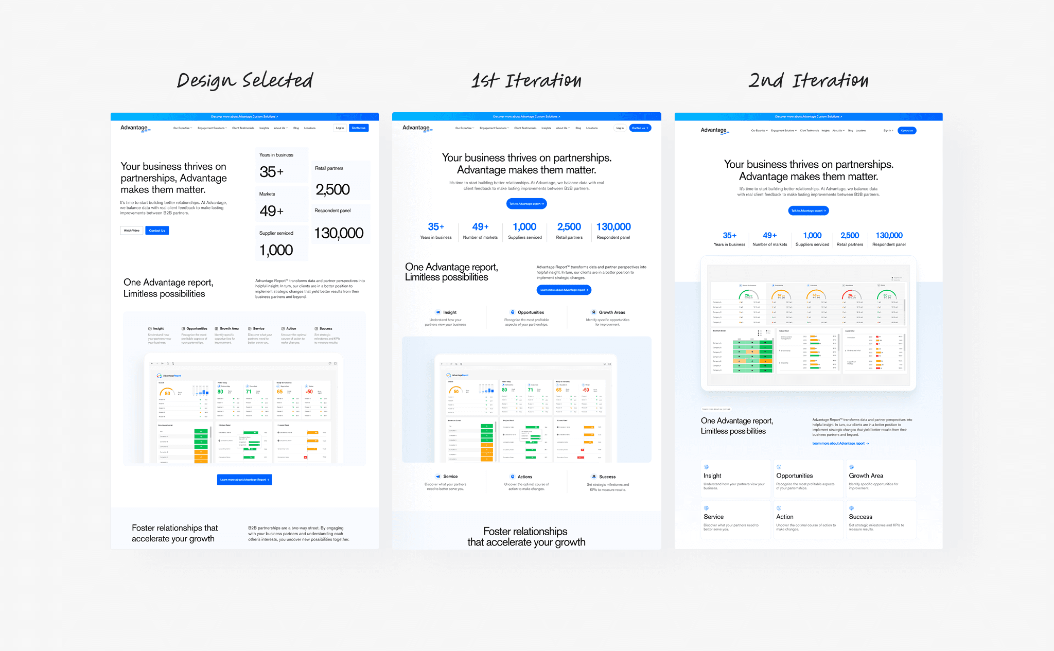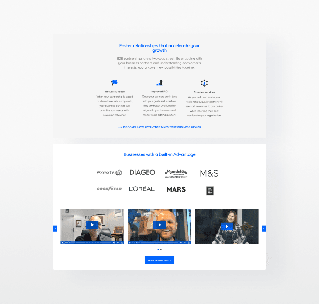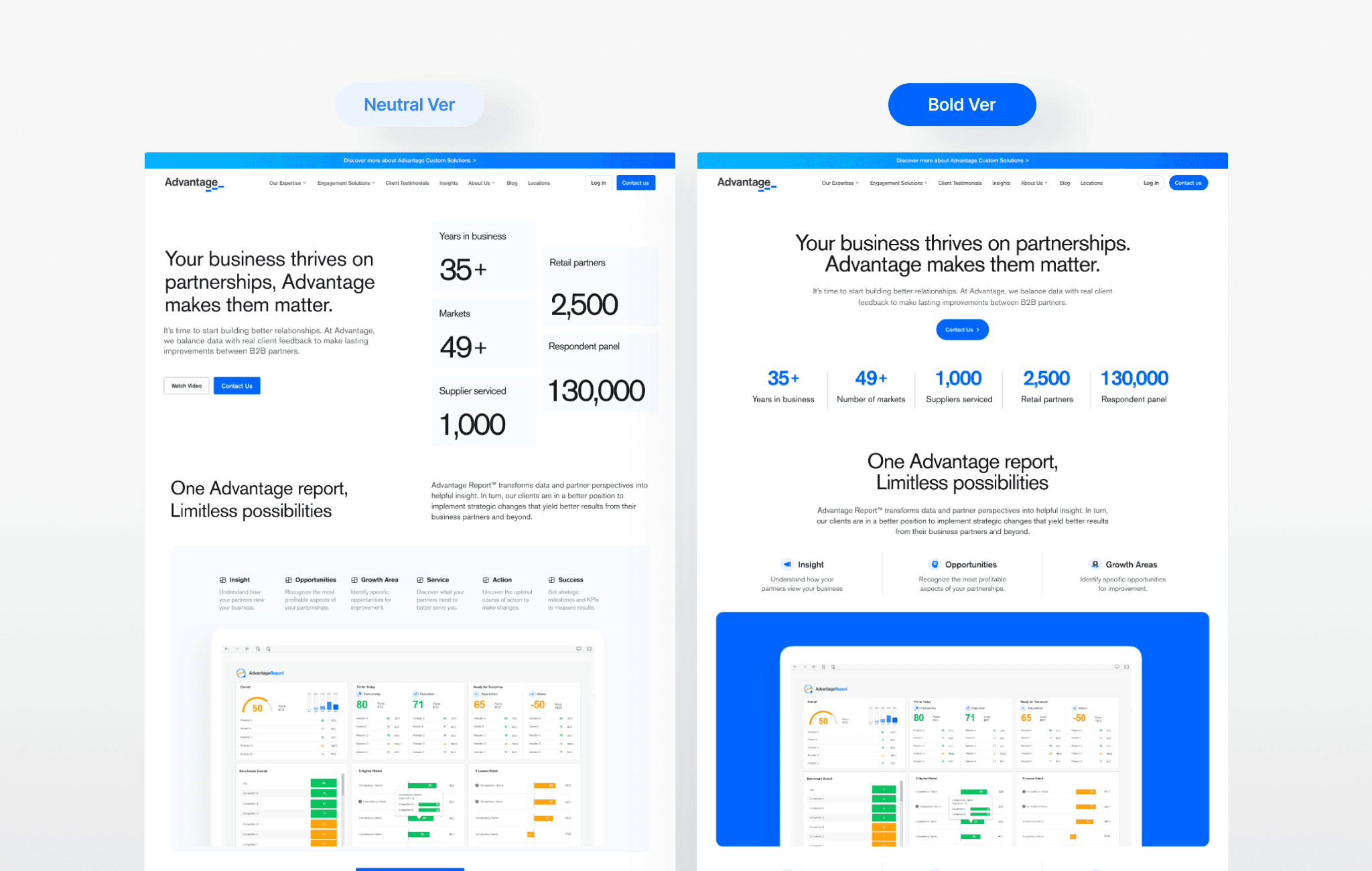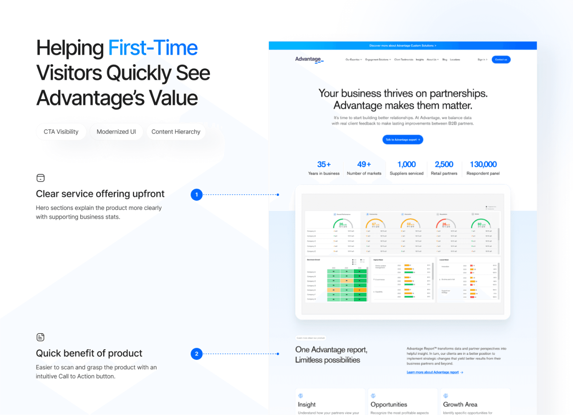 Advantage is a B2B company that helps suppliers and retailers build stronger partnerships through performance tool. Surprisingly, their website was last rebranded in 2019 and needed a redesign to better communicate their value.