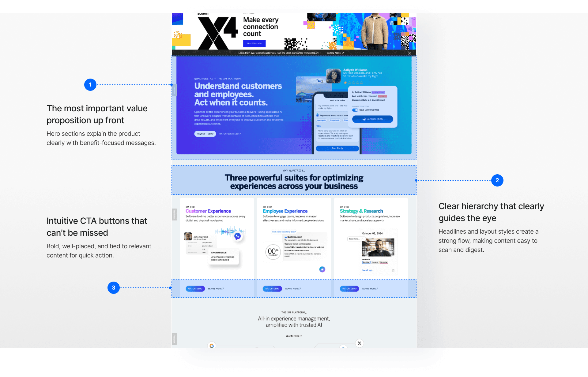I looked at industry leaders like Microsoft Dynamics, Qualtrics, and SurveyMonkey. Their landing experiences weren’t just visually appealing but strategically designed to introduce services and highlight value.